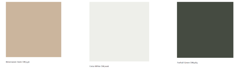 The homeowner desired a similar color palette. Drawing from the Sherwin Williams Timeless Paint collection, we applied Bittersweet Stem 7536 to siding. The Timeless Paint collection represents colors that maintain popularity over the years. Bittersweet Stem is a warm neutral complemented by the cool Foxhall Green 9184 used for the doors. On the trim, Extra White 7006 makes the windows appear larges and keeps the facade light and bright.